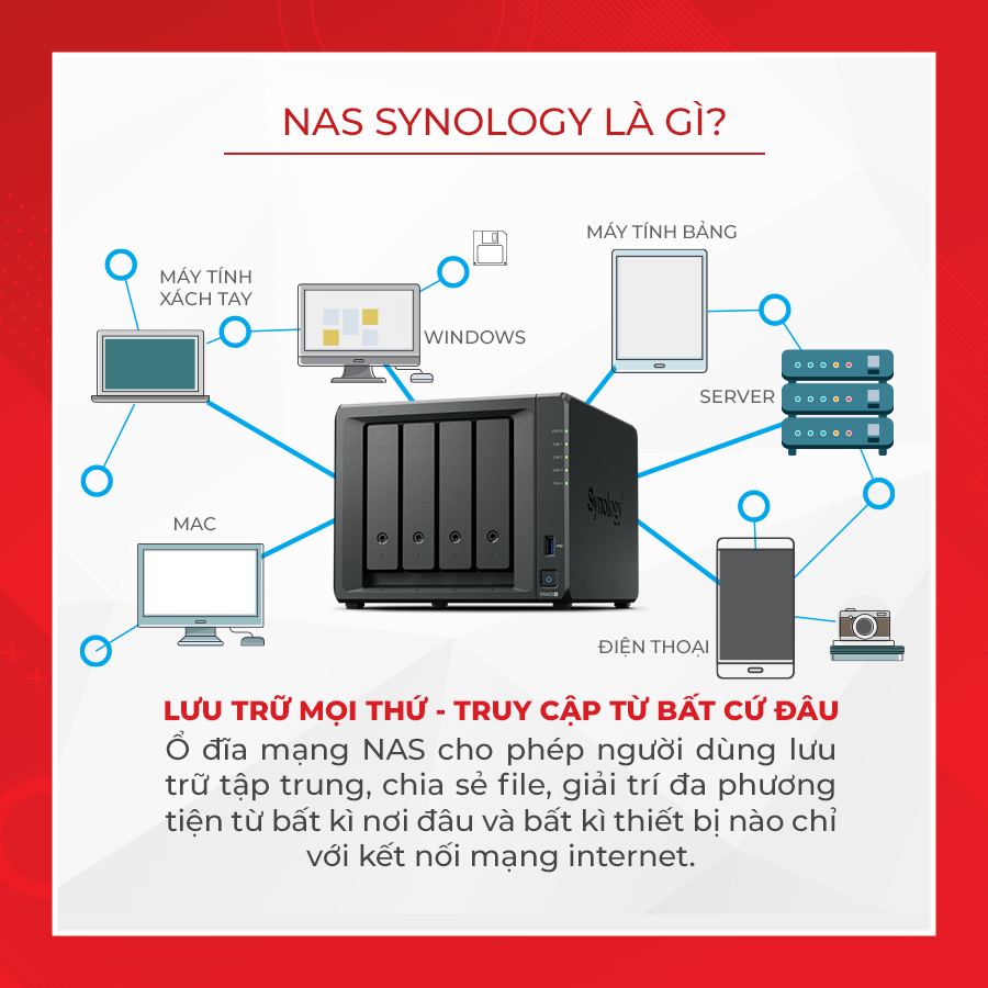 NAS Synology là thiết bị lưu trữ mạng của hãng Synology đến từ Đài Loan, giúp bạn lưu trữ, chia sẻ và truy cập dữ liệu một cách dễ dàng. NAS Synology được thiết kế dành cho Team, doanh nghiệp SME, Enterprise, với các tính năng và khả năng đáp ứng được nhiều nhu cầu lưu trữ và chia sẻ dữ liệu của doanh nghiệp.