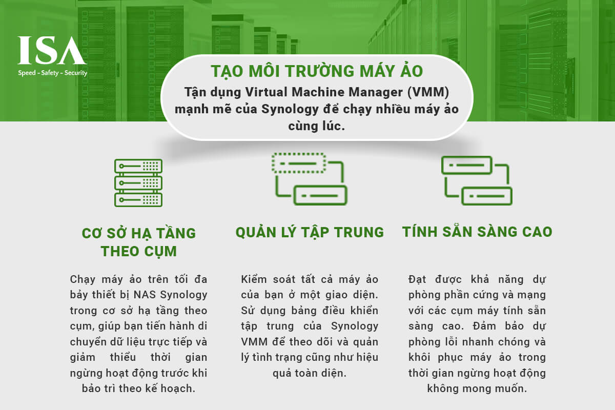 Ảo hóa là một công nghệ tiên tiến và hiệu quả, cho phép bạn khai thác tối đa sức mạnh của Network Attached Storage (NAS) để vận hành các máy ảo và sử dụng làm bộ nhớ cho môi trường máy ảo. Với các tính năng ảo hóa của Synology, bạn có thể tạo ra một môi trường máy ảo linh hoạt, quản lý tập trung và đảm bảo an toàn cũng như tính sẵn sàng cao cho dữ liệu của mình.