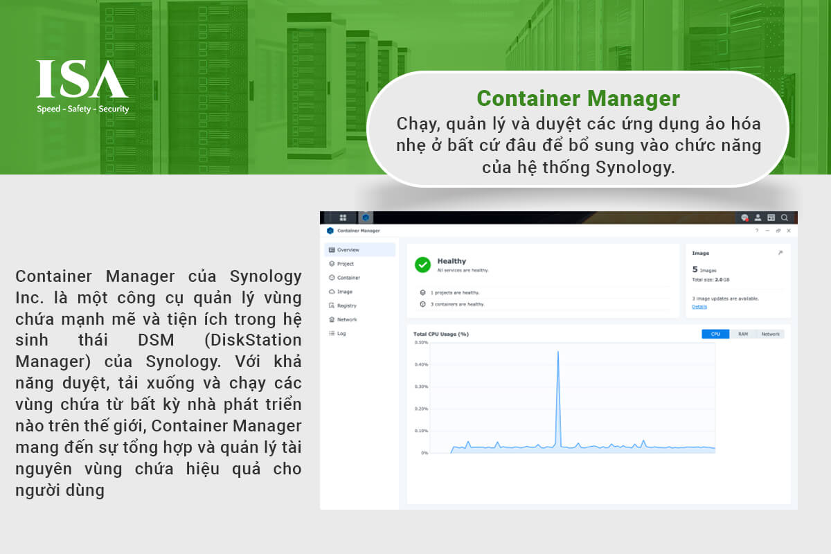 Container Manager của Synology Inc. là công cụ quản lý vùng chứa mạnh mẽ trong hệ sinh thái DSM (DiskStation Manager) của Synology. Với khả năng duyệt, tải xuống và chạy các vùng chứa từ bất kỳ nhà phát triển nào trên thế giới, Container Manager mang đến sự tổng hợp và quản lý tài nguyên vùng chứa hiệu quả cho người dùng.