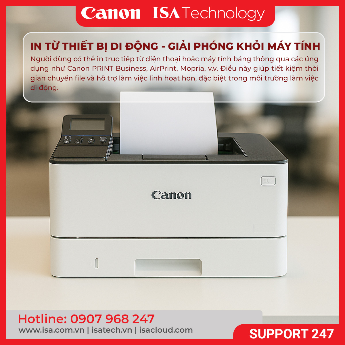 Máy tương thích với các ứng dụng in di động như Canon PRINT Business, AirPrint, Mopria, giúp bạn in tài liệu trực tiếp từ điện thoại thông minh hoặc máy tính bảng mà không cần chuyển file sang máy tính.