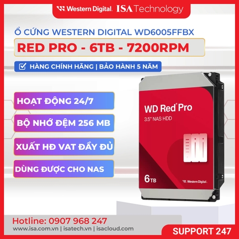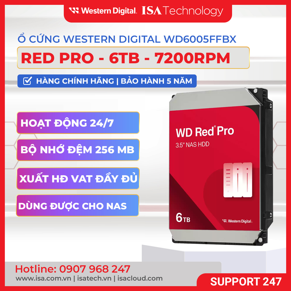 Ổ cứng WD Red Pro 6TB WD6005FFBX là dòng ổ cứng cao cấp được thiết kế chuyên biệt cho hệ thống NAS từ 8 đến 24 bay. Với tốc độ quay 7200RPM, bộ nhớ đệm 256MB và công nghệ ghi CMR, sản phẩm này mang lại hiệu suất vượt trội, độ tin cậy cao và khả năng hoạt động liên tục 24/7 trong môi trường doanh nghiệp vừa và lớn.