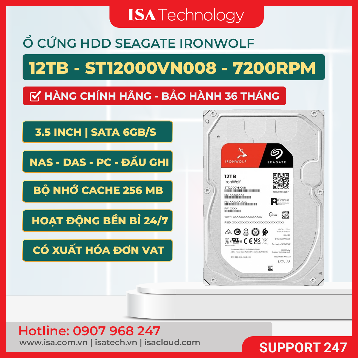 - Tên sản phẩm : Ổ cứng Seagate Ironwolf 12TB SATA 7200rpm 256MB cache (ST12000VN0008) tương thích với Nas
