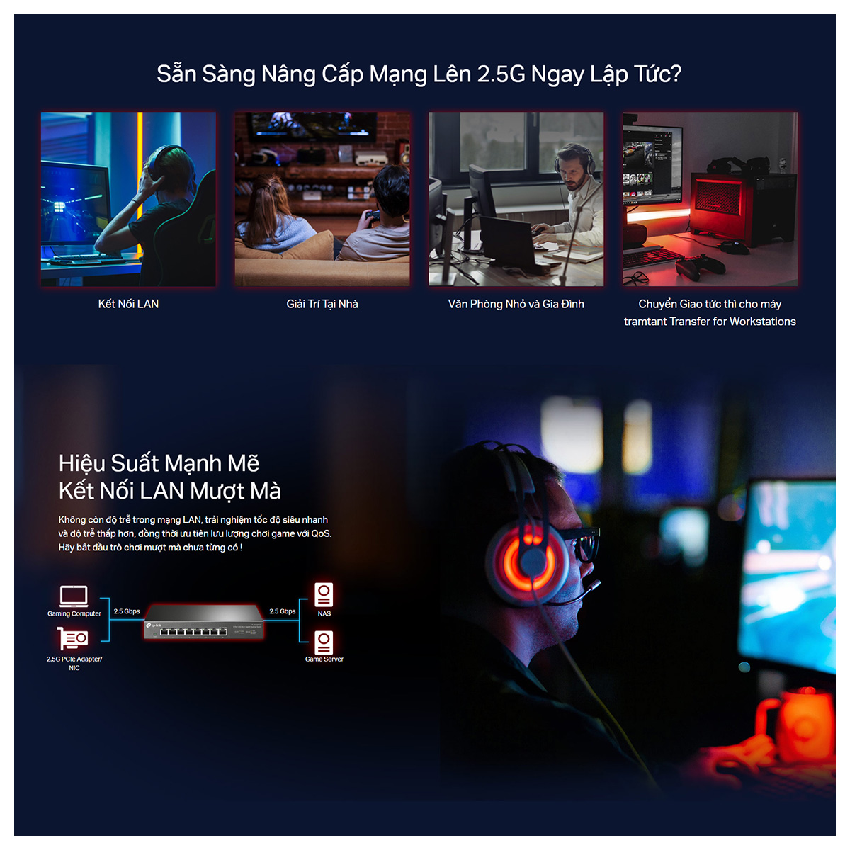 - Gaming không lag: Kết nối PC gaming và máy chủ game với tốc độ 2.5Gbps, giảm độ trễ tối đa.