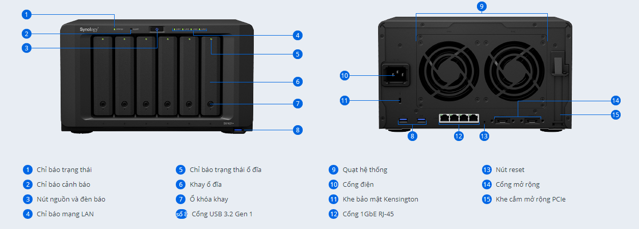 Với bề ngoài chắc chắn và các cổng kết nối đa dạng, NAS Synology DS1621xs+ là một lựa chọn đáng tin cậy cho việc quản lý dữ liệu và ứng dụng trong môi trường doanh nghiệp.