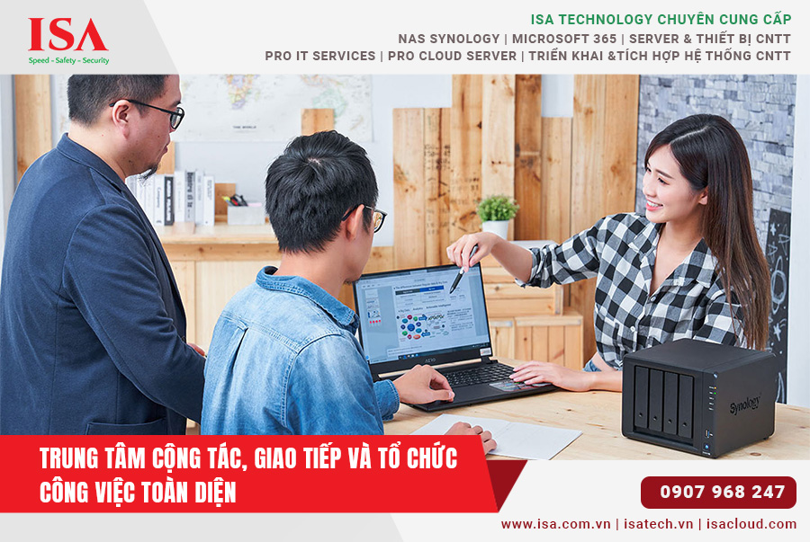 Trong môi trường làm việc hiện đại, khả năng cộng tác, giao tiếp không còn giới hạn trong phạm vi văn phòng nữa mà mở rộng ra các nền tảng trực tuyến, từ xa. Thiết bị lưu trữ NAS Synology DS925+ ghi dấu ấn lớn ở khả năng cung cấp một hệ sinh thái tích hợp cho các hoạt động cộng tác nội bộ như chia sẻ tệp, đồng bộ dữ liệu, duy trì các nhóm làm việc thảo luận, thậm chí tích hợp các ứng dụng trò chuyện, lịch trình. Tính năng này giúp doanh nghiệp nhỏ tiết kiệm chi phí, tăng tính linh hoạt trong quản lý và vận hành, đồng thời giữ vững tính bảo mật cho dữ liệu nội bộ.